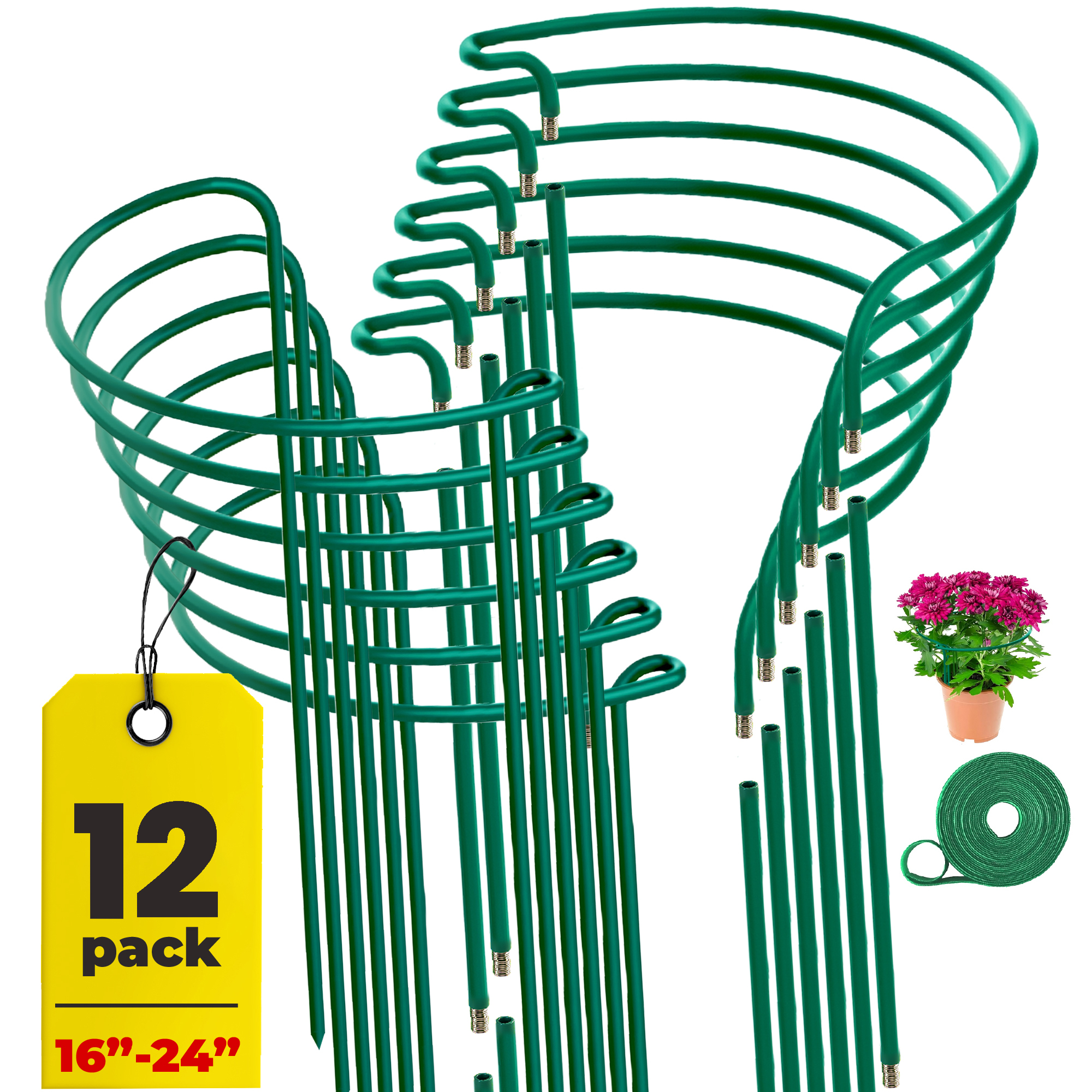 Sturdy and Easy to Use: These plant supports are guaranteed to hold your plants straight, made with premium-grade, rustproof steel core and plastic powder coating for enhanced sturdiness. Each stake can be adjusted to 16\\\" or 24\\\", allowing for customized plant support. Convenient 12-Pack: This set includes 12 plant supports, each with an adjustable length of 16\\\" or 24\\\", and a diameter of 10\\\". Ideal for various gardening needs, compatible with a wide selection of greens. Multi-Purpose Use: The K-Brands decorative supports are incredibly versatile and can be used independently, in circles, combined, or in long rows, depending on your plants’ needs, making them perfect for both indoor and outdoor use. Blends In Naturally: The dark green color seamlessly blends with your plants, ensuring that the supports do not distract from your garden’s beauty. Bonus 10Ft Plant Tie: This pack includes a practical 10-foot plant tie roll, making your gardening tasks easier by providing additional support for your plants as they grow straight and healthy.