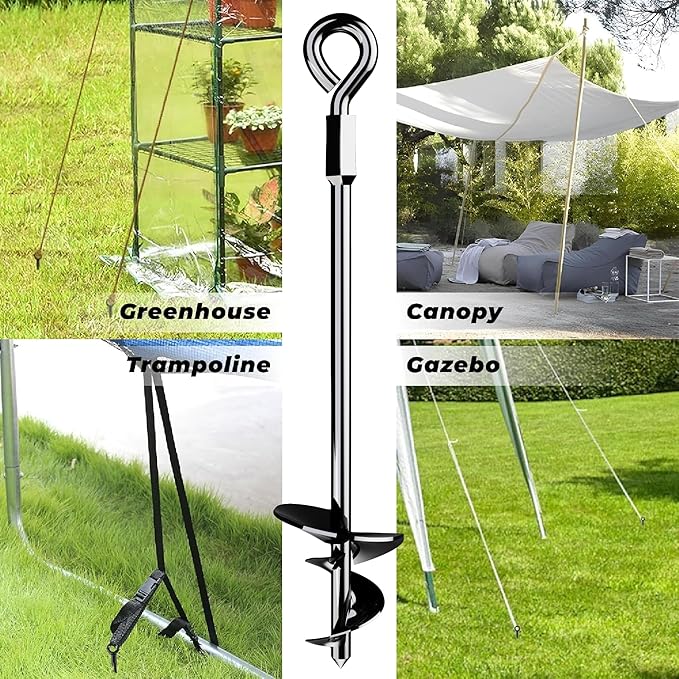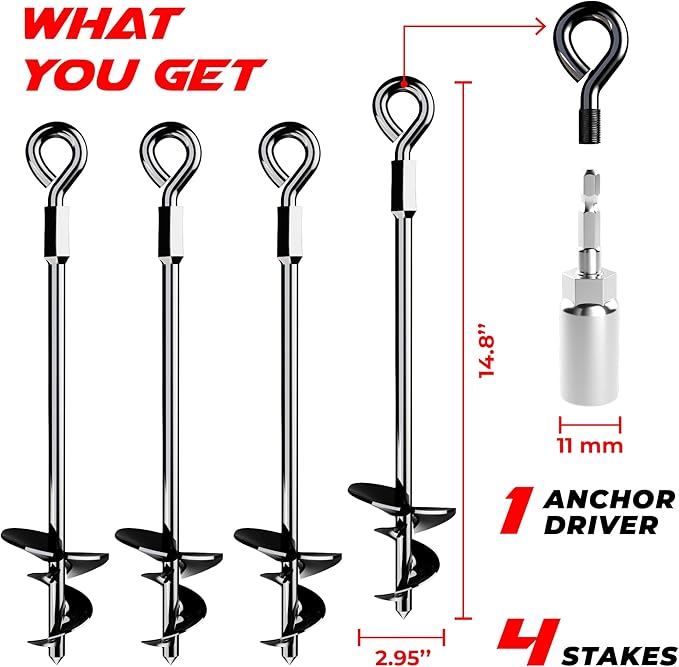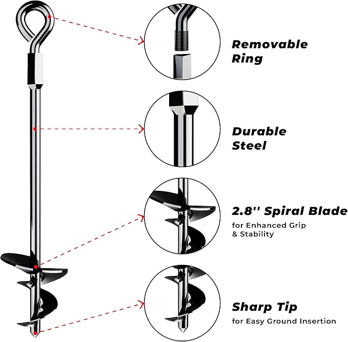 EXCEPTIONAL STABILITY IN ALL CONDITIONS: Designed with a sharp tip and spiral blades for a firm grip, our 15 -inch ground anchors deliver outstanding stability, even in strong winds. The durable materials and removable round ring design ensure effortless installation and consistent, reliable results