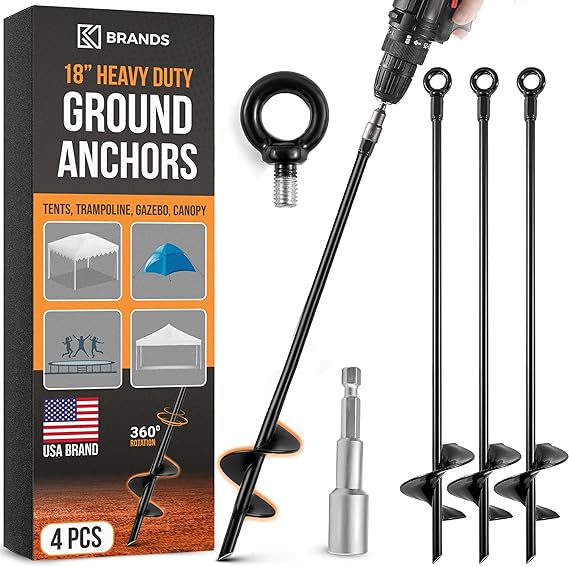 PREMIUM GROUND ANCHORS: Secure your outdoor structures with absolute confidence using our heavy-duty 14.4-inch ground anchors. Engineered for deeper insertion and superior wind resistance, these anchors are crafted from durable, rust-free tungsten steel with powerful helical blades for maximum holding power. Equipped with removable Round Ring Eye Hooks, they offer incredible versatility and ease of use. This pack of four provides the perfect solution for all your anchoring needs STRONG & RELIABLE: Our ground anchors are meticulously crafted from solid tungsten steel, ensuring unmatched strength and durability. With 360-degree precision welds between the helix and shaft, you can count on a robust and reliable anchoring solution that delivers exceptional, long-lasting performance UNPARALLELED STABILITY: Offering superior stability with a sharp tip and expertly designed spiral blades, our 14.4-inch ground anchors hold firm even in strong winds. Built from durable materials and featuring a convenient removable round ring design, they provide effortless installation and unwavering performance in any condition EASY INSTALLATION, HASSLE-FREE USE: Simplify your outdoor projects with our user-friendly ground anchors, designed for quick, secure, and versatile installation. The removable eye hooks make adjustments easy, whether installing manually with a rod or using a drill or impact wrench. These anchors offer seamless and flexible installation every time VERSATILE & DEPENDABLE: Perfect for a wide variety of applications, our ground stakes are ideal for securing greenhouses, canopies, gazebos, swing sets, trampolines, playgrounds, deer stands, and more. Whatever your outdoor needs, these anchors provide reliable and robust support, ensuring stability and peace of mind for any structure or setup