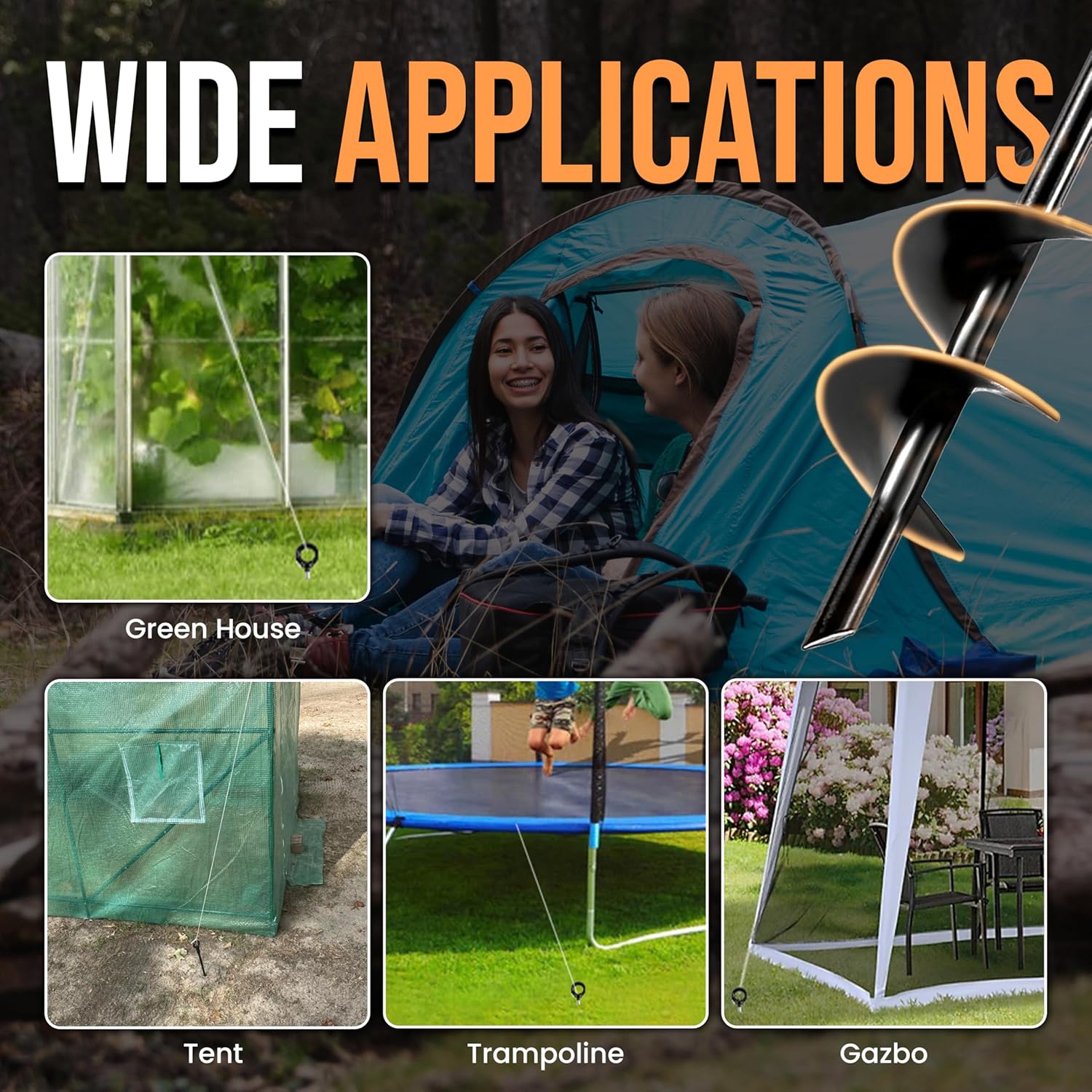 Screw-In Spiral Design for Maximum Stability: Our auger-style anchors feature sharp tips and 3-inch helix blades, allowing them to drill deep into dirt, sand, or clay. Ideal for carports, greenhouses, and canopy tie downs, these screw-in stakes provide unbeatable grip and hold